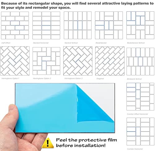 - Come in a box of 100 sheets premium PVC subway tiles, 2.95"x5.9"x0.12" each, cover about 12.1 square feet. This simple subway pattern is easier to install and reduces cutting waste, much thicker than vinyl tiles on the market.