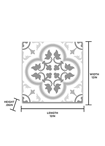 Details: Brighten up kitchen and bathroom floors with these peel and stick tiles. A grey gothic-style motif effortlessly complements a crisp white background. Remy Peel & Stick Floor Tiles Peel and Stick Tiles contains 10 pieces on 10 sheets that each measure 12 x 12 inches. This product measures 60-in x 24-in x .06-in when assembled.
